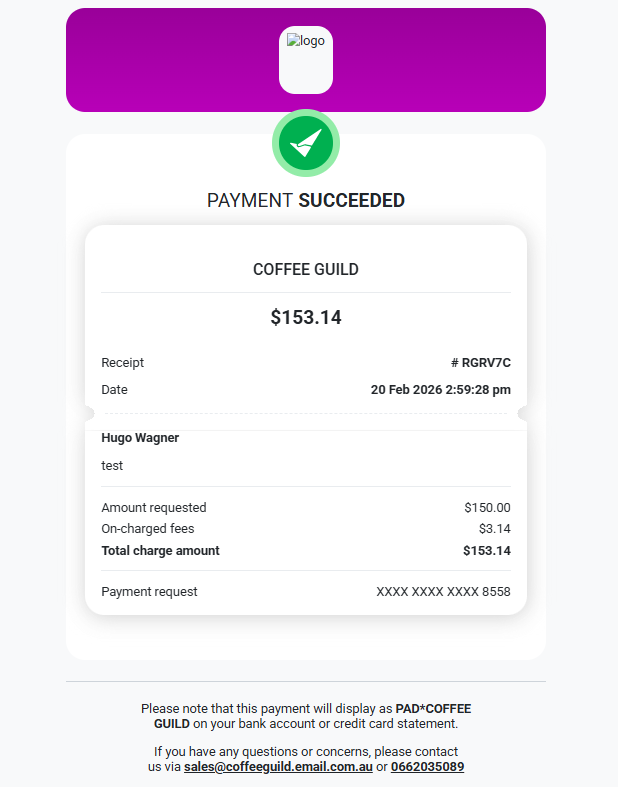 Once you have sent your customer the Payment Request link, the following details will be displayed when they open it. Your company details and the details of the payment will be clearly visible.