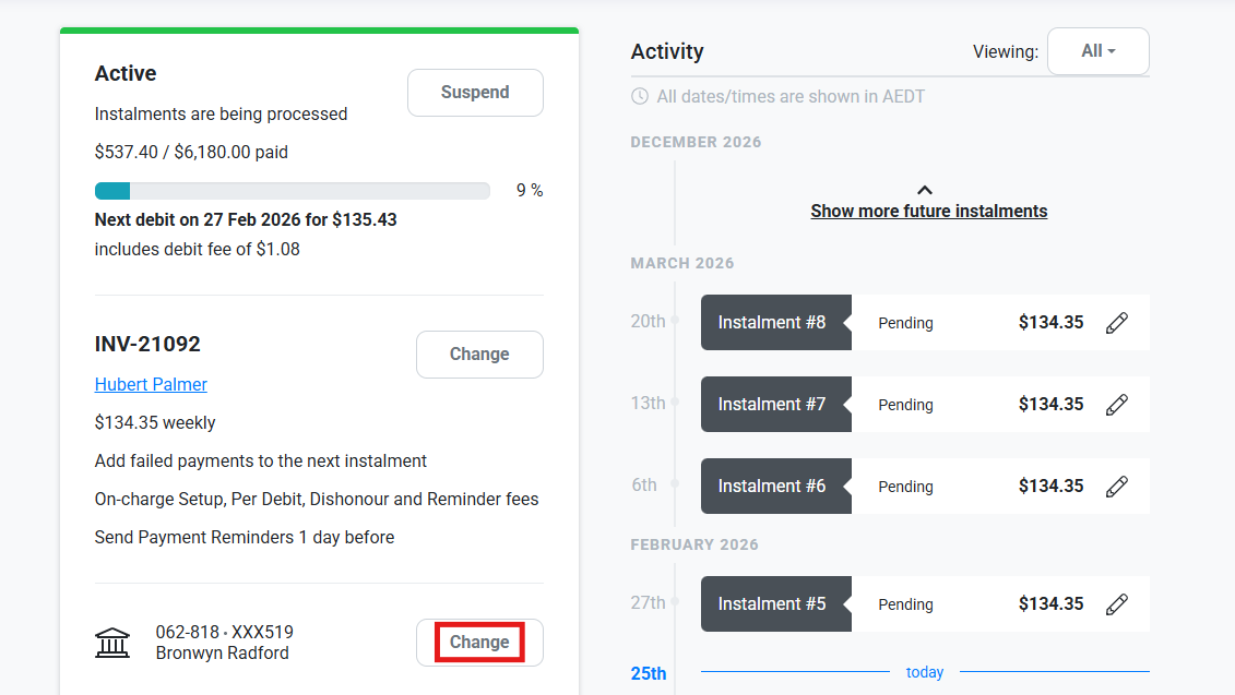 If your customer needs to update the bank account or card details linked to their active Direct Debit schedule, you can send them a Change of Account link via the Direct Debit page.