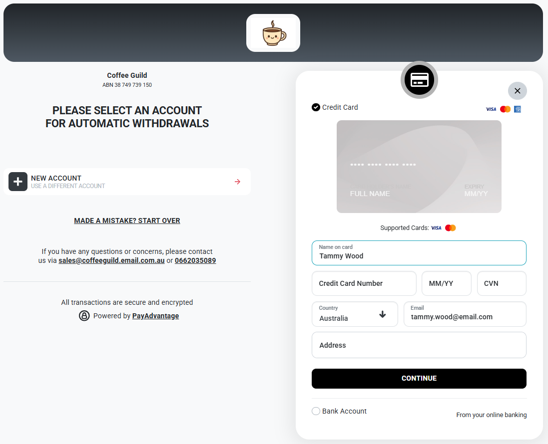 Once the customer receives and opens the link, they will be prompted to update their payment details. They can enter either their BSB and account number or their credit or debit card details.