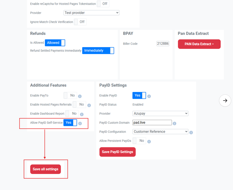 The Allow PayID Self Service Setting will be ON by default in the merchant settings on their account. This means that merchants can initiate PayID activation directly within their account.